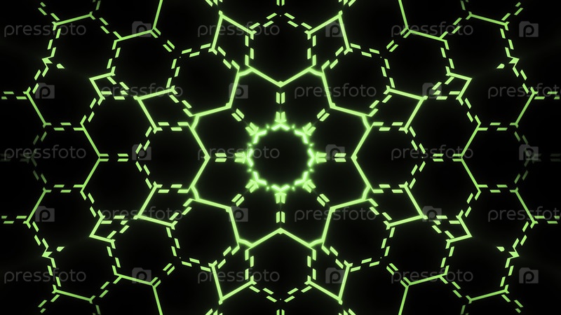 Неоновая сетка с шестиугольниками и движущимися линиями.Движение.Цветочный светлый рисунок с движущимися линиями. Цветковый двигающийся кибер-рисунок с шестиугольниками на черном фоне