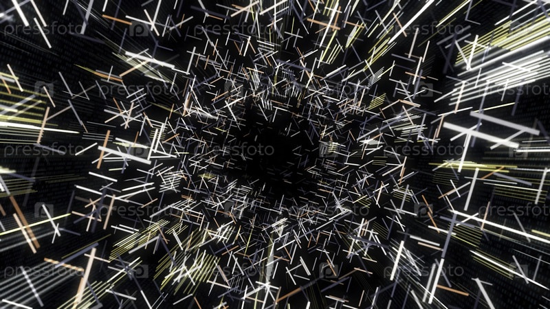 Футуристический тоннель сломанных линий. Анимация. Красивый кибер-туннель геометрических линий и штрихов на черном фоне. Абстрактный туннель из движущихся сломанных штрихов матрицы