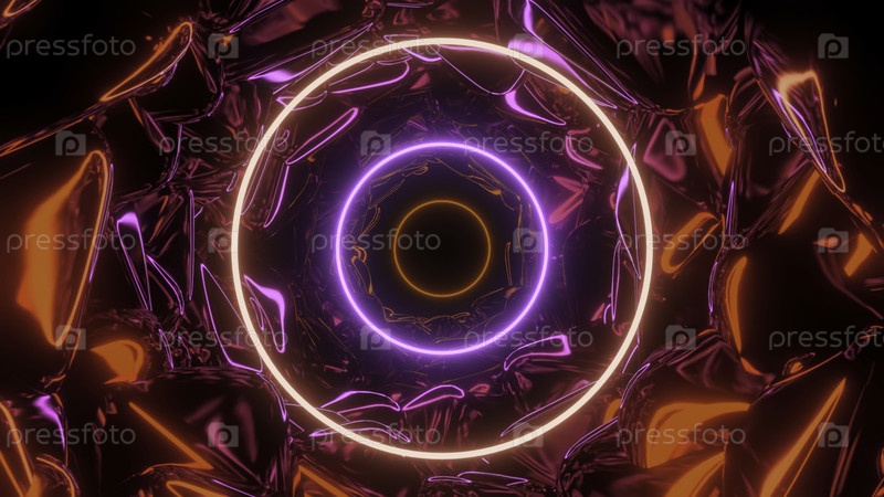 Футуристический неонный туннель с волнами и кольцами Дизайн. Движущийся тоннель с глянцевым неоном и яркими кольцами. Futuristic cyber tunnel with 3d walls and glowing circles