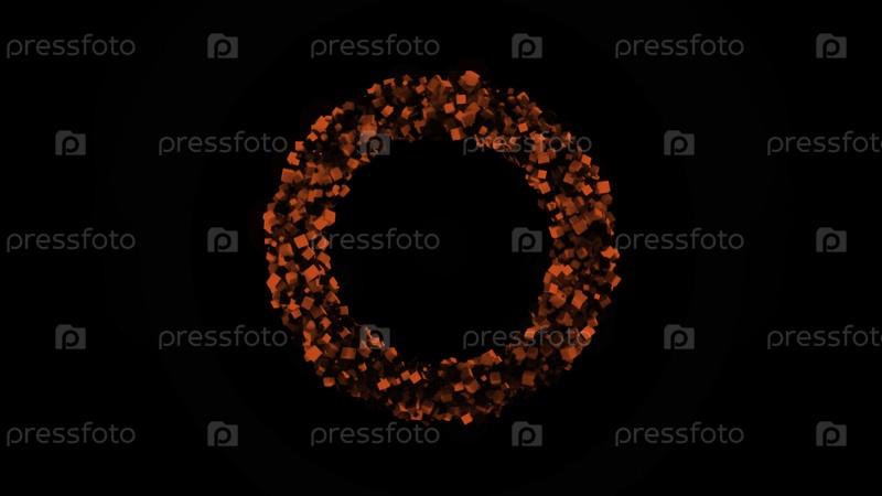 Круг из множества красных частиц, летящих в стороны на черном фоне. Анимация. Абстрактное кольцо сформировано крошечными пирамидами и кубиками