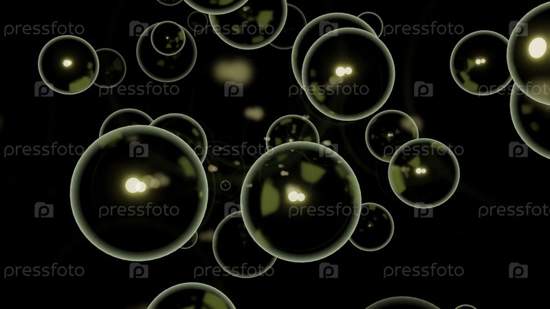 Черный фон. Дизайн. Яркие пузыри с белым и желтым освещением больших размеров в анимации летают в разных направлениях