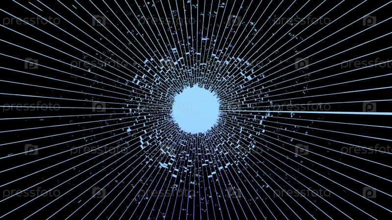 Движение внутри абстрактного цифрового коридора в сторону синего светящегося ядра. Дизайн. вращающийся туннель с лучами и мелкими частицами вокруг яркого круга посередине