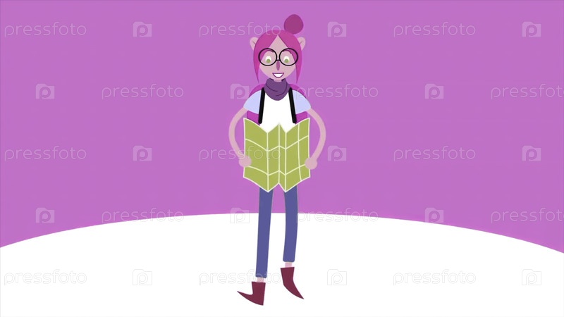 Анимация мультфильма о улыбающейся девушке-туристке, которая гуляет по новому городу с картой в руках на розовом фоне