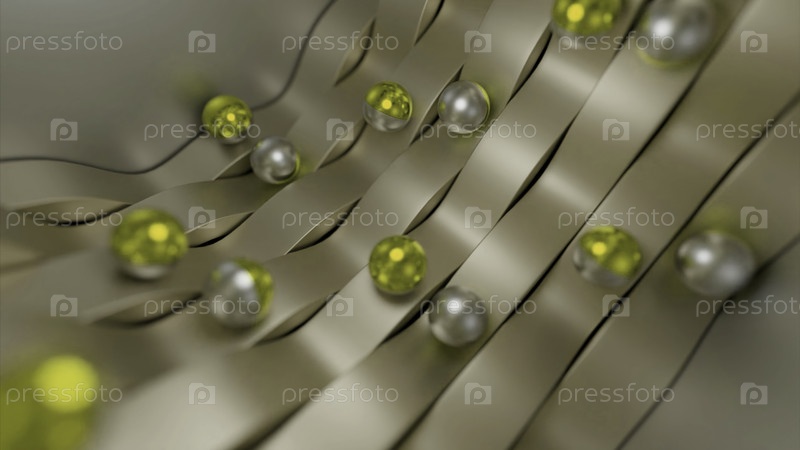 Металлические шары, прокатывающиеся на изгибающихся плоских полосках. Дизайн. Сферы в противоположном направлении