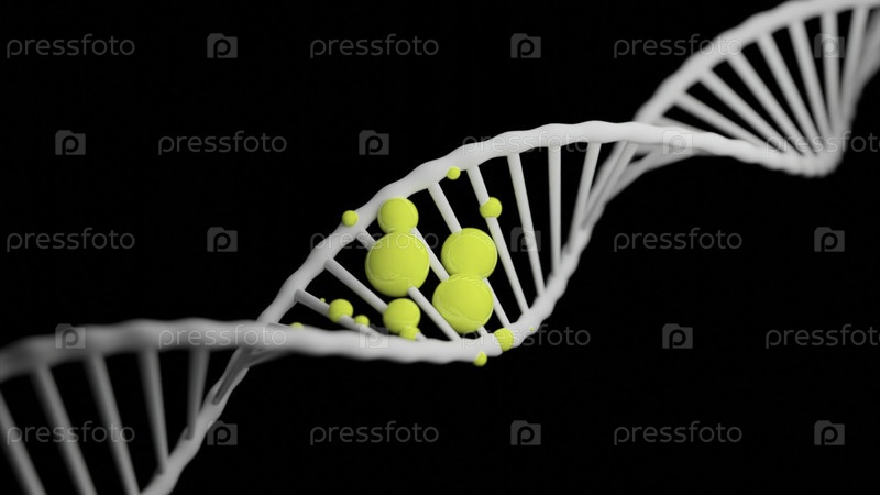 Цветные молекулы на ДНК. Дизайн. 3D-анимация цепи ДНК с движущимися молекулами. Болезнь структуры ДНК в виде цветных молекул