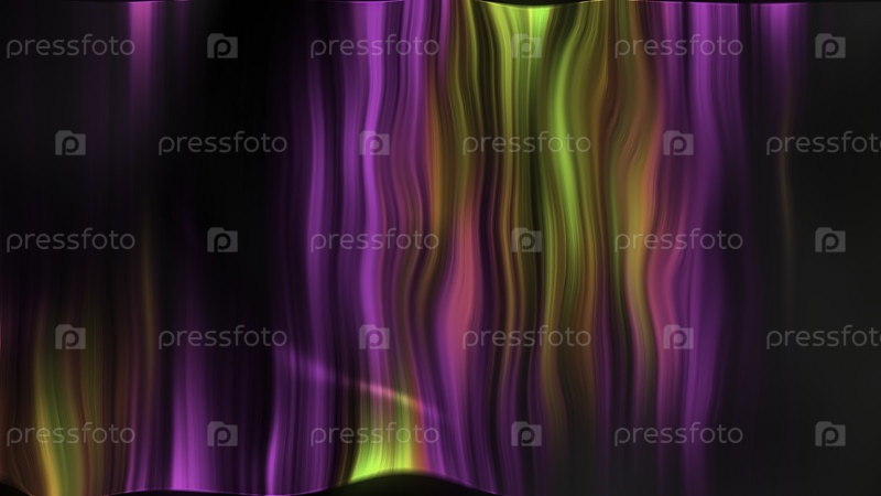 Это яркое видео показывает текущие шторы в фиолетовом, зеленом и желтом цветах, раскачивающиеся на черном фоне, создавая красочную и живую атмосферу
