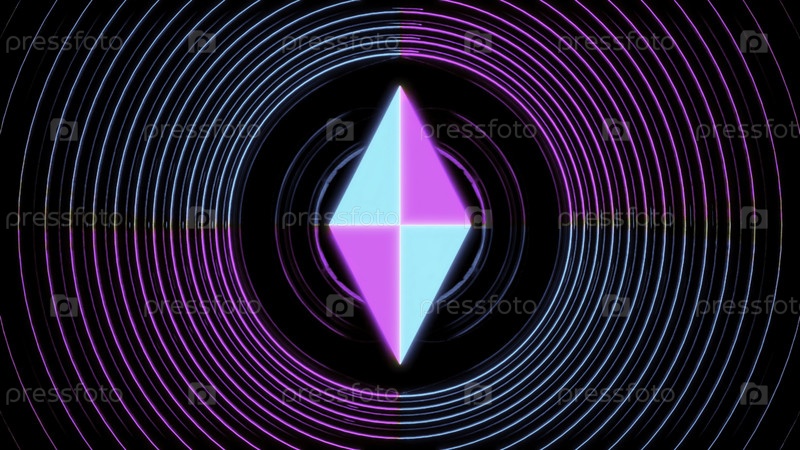 Светящийся геометрический ромб вращается. Дизайн. 3D светящийся ромб вращается в центре кругов. 3D ромб в центре кругов на черном фоне