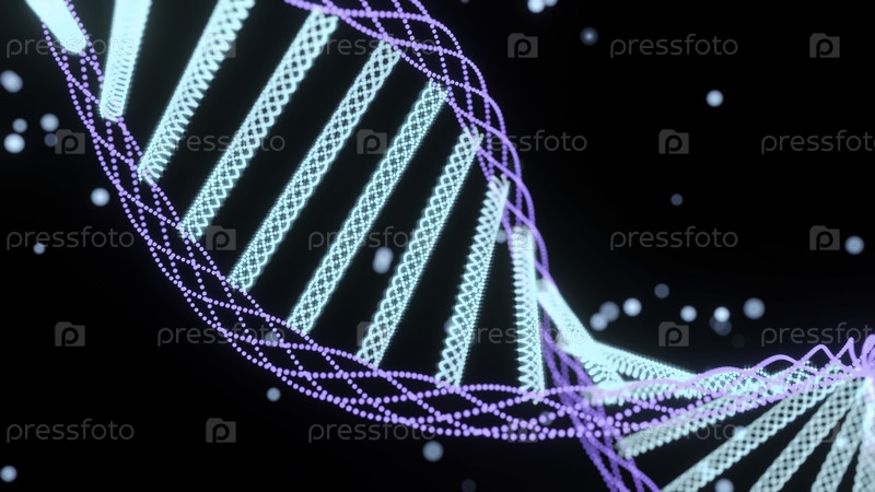 Анимация вращающейся структуры ДНК, зеленые и фиолетовые цифровые волны на черном фоне