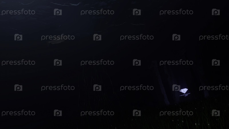 Темный морской подводный фон с плавающей рыбой. Дизайн. Абстрактная рыба, плавающая среди водорослей на фоне скал