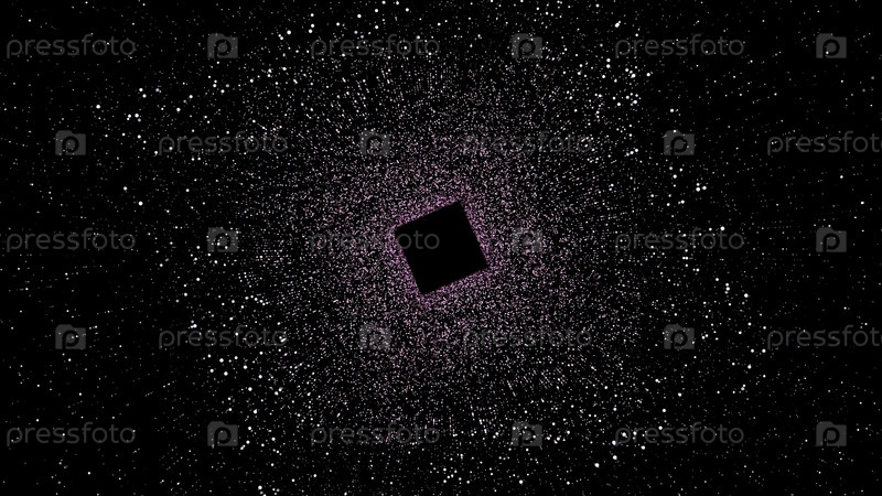 Абстрактный космический туннель с квадратом, окруженным миллионами светящихся частиц. Движение. вращающийся черный квадрат, окруженный космической пылью