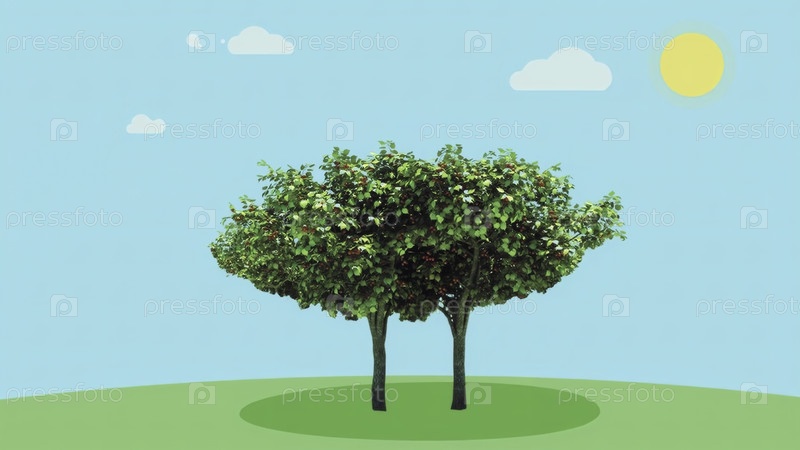 Живая пара пышных, зеленых деревьев из мультфильмов счастливо греется под теплым солнечным светом с пушистыми облаками вокруг них