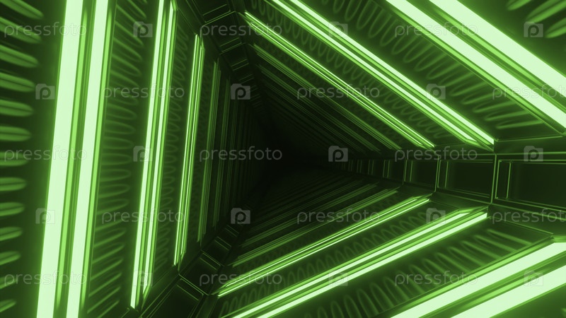 Поворачивающийся треугольный туннель с неоновыми линиями. Дизайн. Треугольный тоннель с неоновыми линиями в стиле космического корабля. Триугольный кибер-тунел в космическом корабле