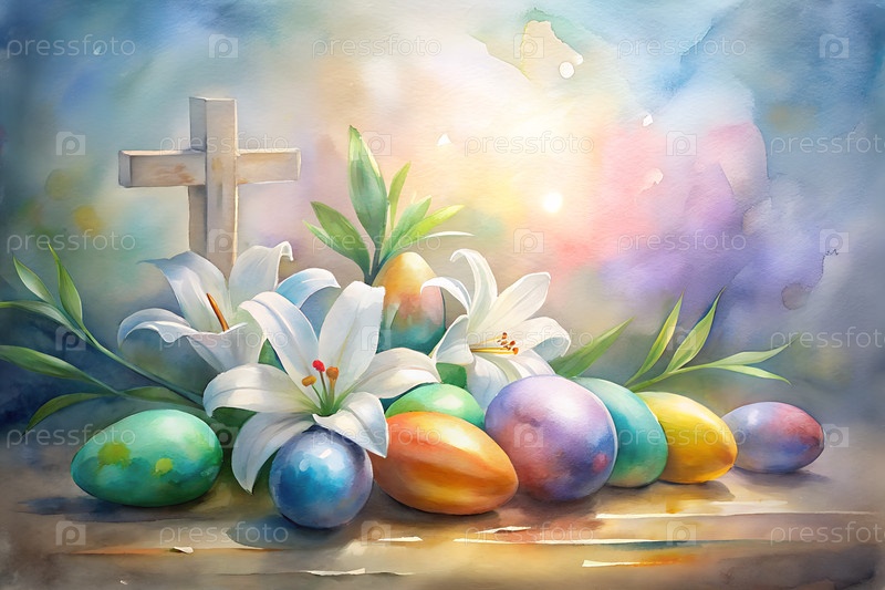 Христианские пасхальные натюрморты с деревянным крестом, лилиями и украшенными яйцами в весеннем солнечном свете символизируют сцену воскресения