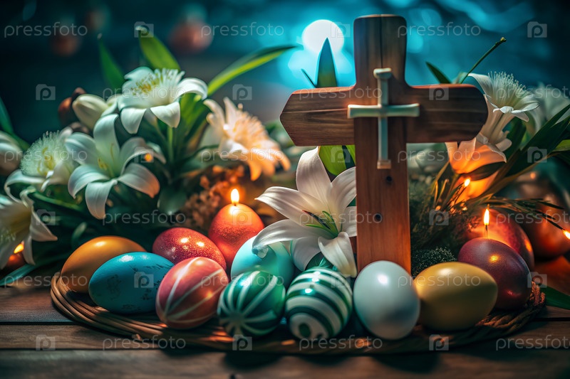 Христианские пасхальные натюрморты с деревянным крестом, лилиями и украшенными яйцами в весеннем солнечном свете символизируют сцену воскресения