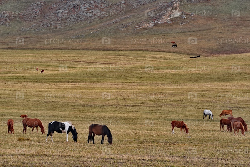 Россия. Горный Алтай. Табуны лошадей мирно пасутся на свободных осенних пастбищах близ села Ябоган