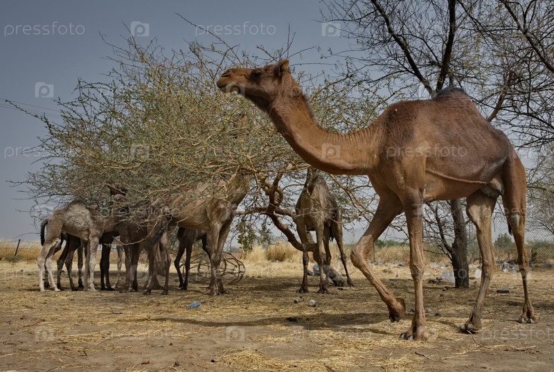 Центральная Африка. Нджамена, Чад, Небольшое стадо одногорбых верблюдов пасутся в полупустынной местности с растущей акацией, объедая мелкие листочки деревьев несмотря на громные колючки
