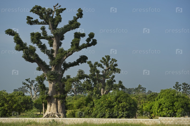 Западная Африка. Сенегал. Живописная панорама с одинокими огромными баобабами на арахисовом поле в лучах заходящего солнца