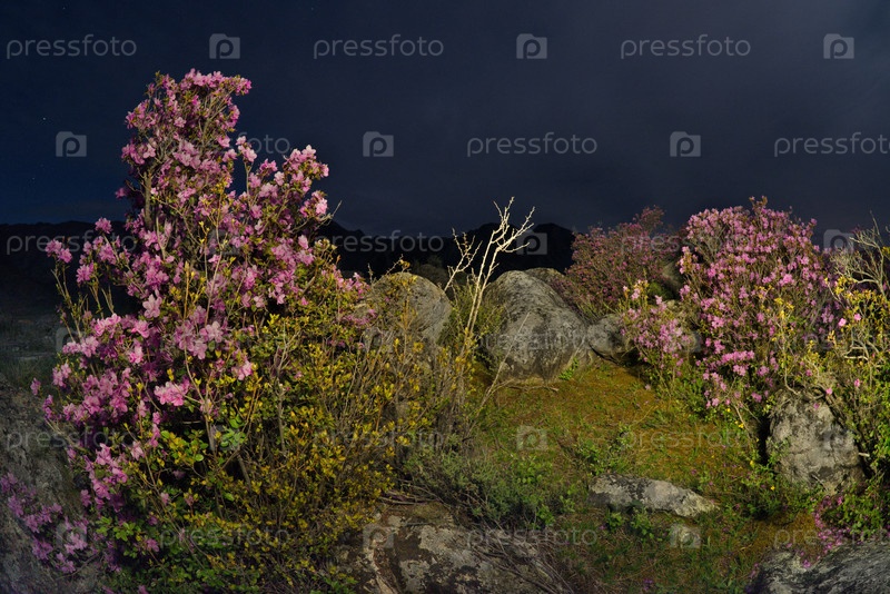 Россия. Юг Западной Сибири, горный Алтай. Цветущие кусты рододендрона Ледебура среди замшелых камней в долине реки Катунь лунной ночью