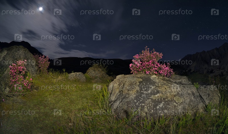 Россия. Юг Западной Сибири, горный Алтай. Цветущие кусты рододендрона Ледебура среди замшелых камней в долине реки Катунь лунной ночью