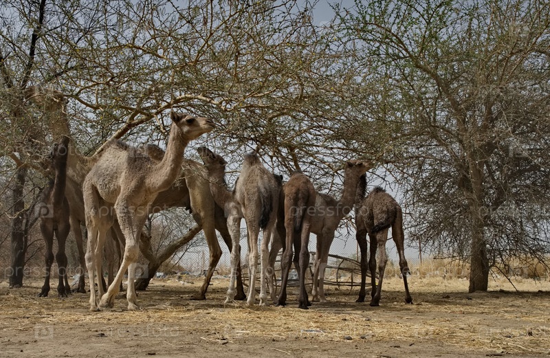 Центральная Африка. Нджамена, Чад, Небольшое стадо одногорбых верблюдов пасутся в полупустынной местности с растущей акацией, объедая мелкие листочки деревьев несмотря на громные колючки
