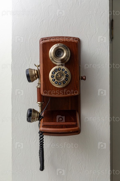 Это классическое устройство в ретро-стиле имеет телефонную трубку и нажатие кнопки, установленные на текстурированной белой стене