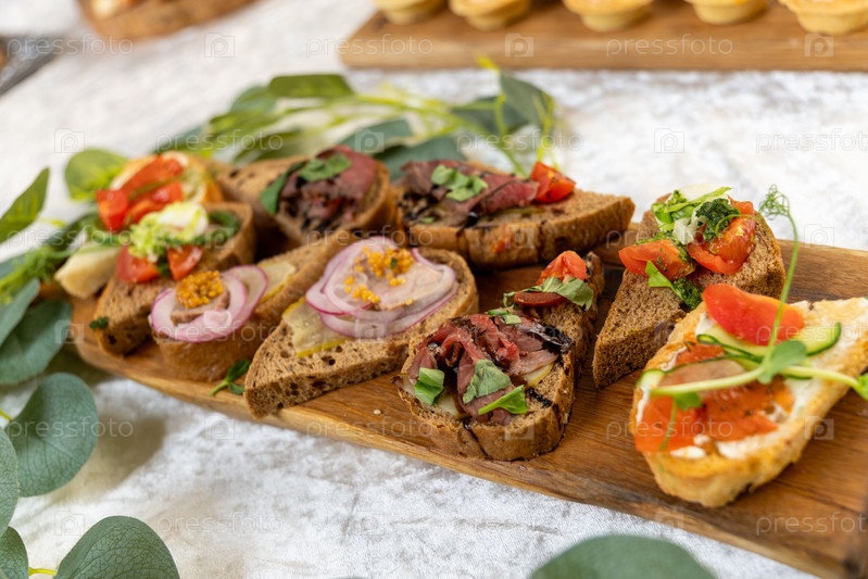 Разнообразная гурманская брушетта с мясными, помидорами, луком и сыром на деревянной доске.Украшена листьями эвкалипта на белой скатерти, идеально подходит для общественного питания или буфетов