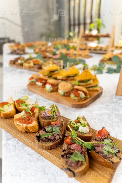 Элегантный кейтеринг с свежими закусками на многоуровневых стендах, идеально подходит для свадеб или мероприятий