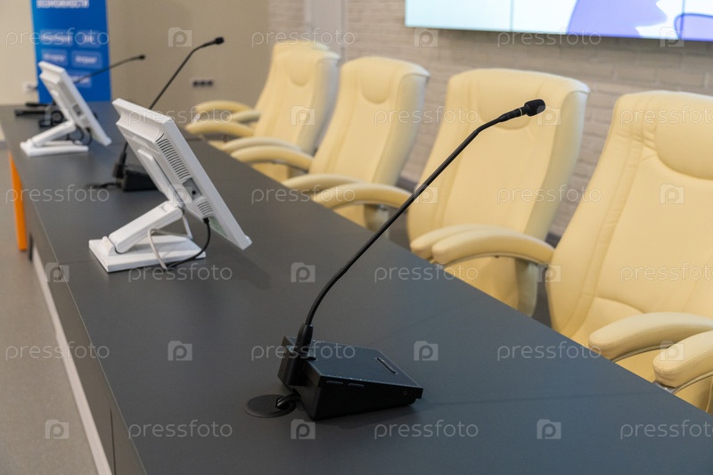 Современный конференц-зал с микрофонами, мониторами и пустыми стульями за столом заседаний, подготовленный для деловой презентации, брифинга или пресс-конференции
