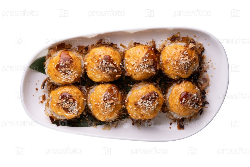 Сверху вниз вид восьми выпеченных рулонов суши с кремовой апельсиновой начинкой, соусом угрей и кунжутными семенами на белом блюде