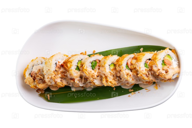 Сверху вниз вид рулонов суши на зеленом листе на белой керамической тарелке. Рулоны содержат рис, авокадо, рыбу, кремовый соус, хрустящие жареные луки. Изолировано на белом фоне для меню или рекламы