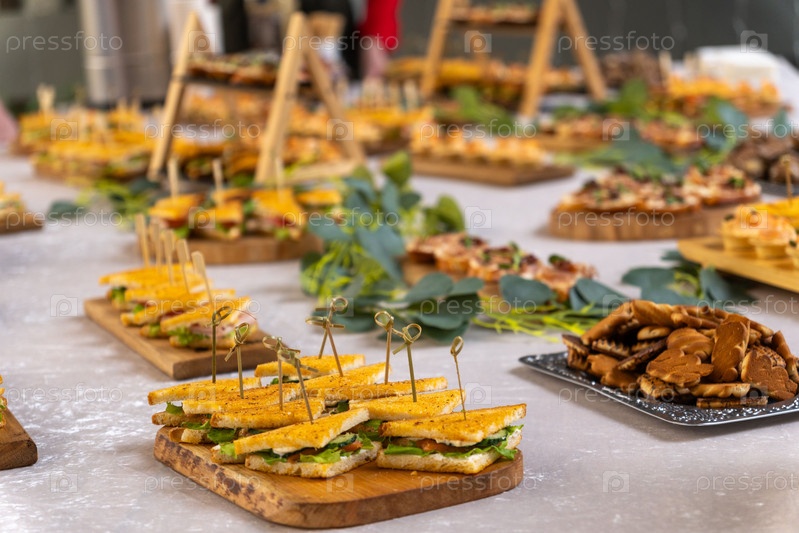 Буфетный стол с сендвичами, каннапесами и закусками на деревянных досках, украшенный зеленью, идеально подходит для вечеринки, свадьбы или корпоративного мероприятия