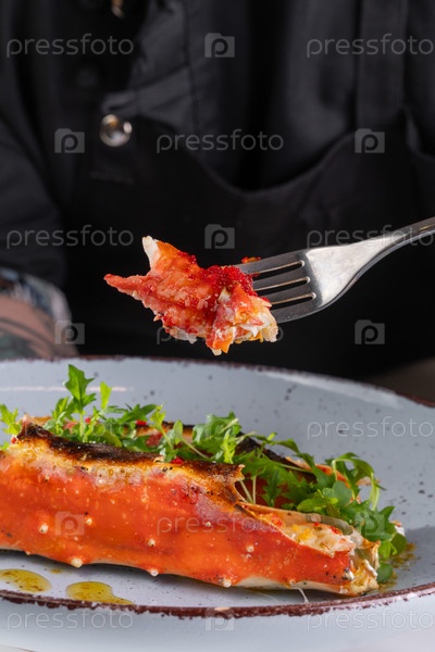 Гурманская обжаренная королевская крабковая нога подается на серой тарелке