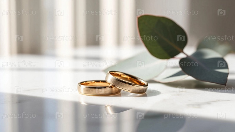 Два золотых обручальных кольца на светлом фоне и лист эвкалипта. wedding rings with a wedding decor