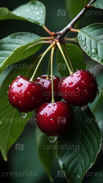 Свежая спелая аппетитная вишня. Черешня крупный план. Вишня с листом висит на ветке в каплях росы