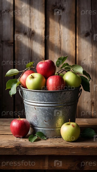Урожай свежих красных яблок. Разноцветные спелые яблоки лежат в алюминиевом ведре на деревянных досках. Деревенский урожай