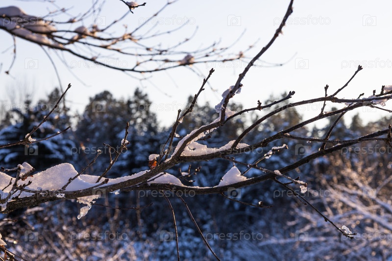 Морозные ветви деревьев со снегом под ярким зимним небом