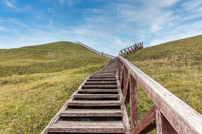 Пешеходная тропа с деревянными ступеньками поднимается на яркий травянистый горный холм