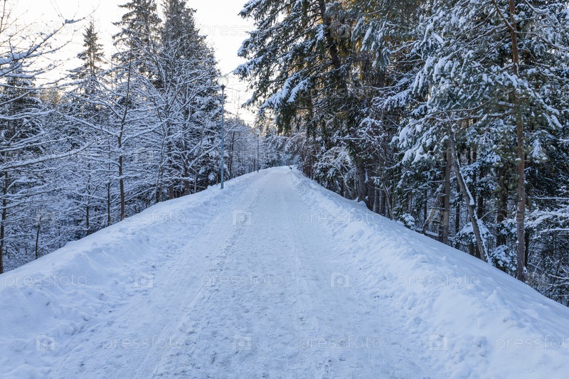 Заснеженная дорога простирается через тихий зимний лес с высокими деревьями, покрытыми морозом и свежим снегом под мягким утренним светом