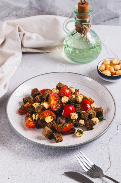 Смесь помидоров, сыра и крутонов ржи на тарелке на столе вертикальный вид