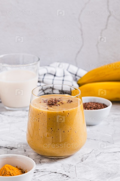 Смоути сделанный из кокосового молока, бананов, куркумы и льняных семян в стеклянном вертикальном видении