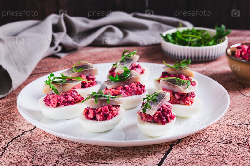 Половины яиц, набитых сельдью под меховым пальто на тарелке на столе