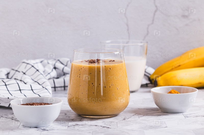 Смоути из кокосового молока, бананов, куркумы и льняных семян в стакане на столе