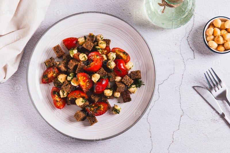 Салат из ржаного хлеба, вишневых помидоров и копченого сыра на тарелке на столе