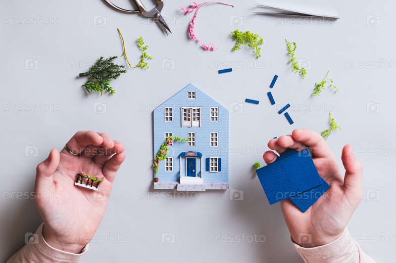 Подробности сборки модели дома в детских ладонях на синем фоне, вид сверху