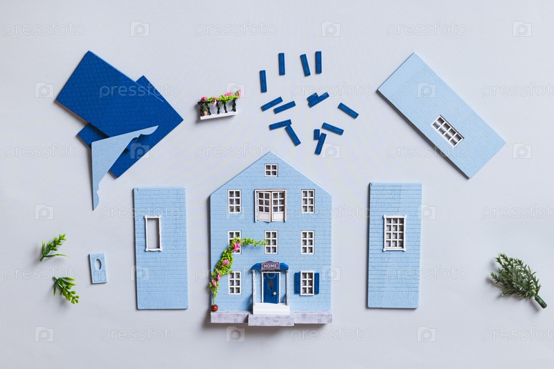Подробности сборки модели миниатюрного дома на синем фоне, верхний вид