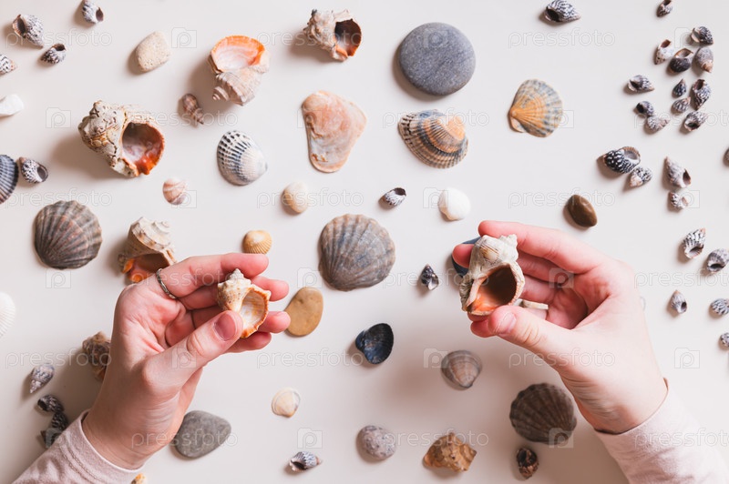 Детские руки, держащие моллюски на фоне стола с моллюсками и гальками
