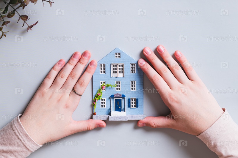Статуя дома и детские руки на синем фоне, концепция комфорта