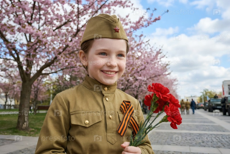 Концепция праздника 9 мая.Портрет девушки в военной форме с ленточкой Святого Георгия и красными гвоздиками, отмечающей День Победы в 1941-1945 годах