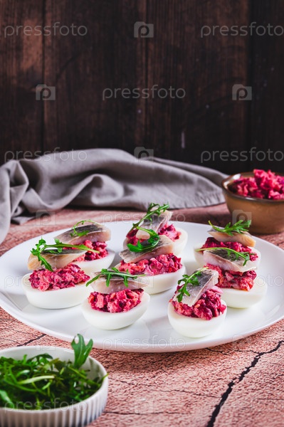 Половины яиц, набитые сельдью под меховым пальто на тарелке на столе вертикальный вид
