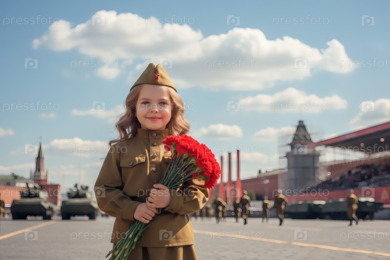 Концепция праздника 9 мая.Портрет девушки в военной форме с ленточкой Святого Георгия и красными гвоздиками, отмечающей День Победы в 1941-1945 годах
